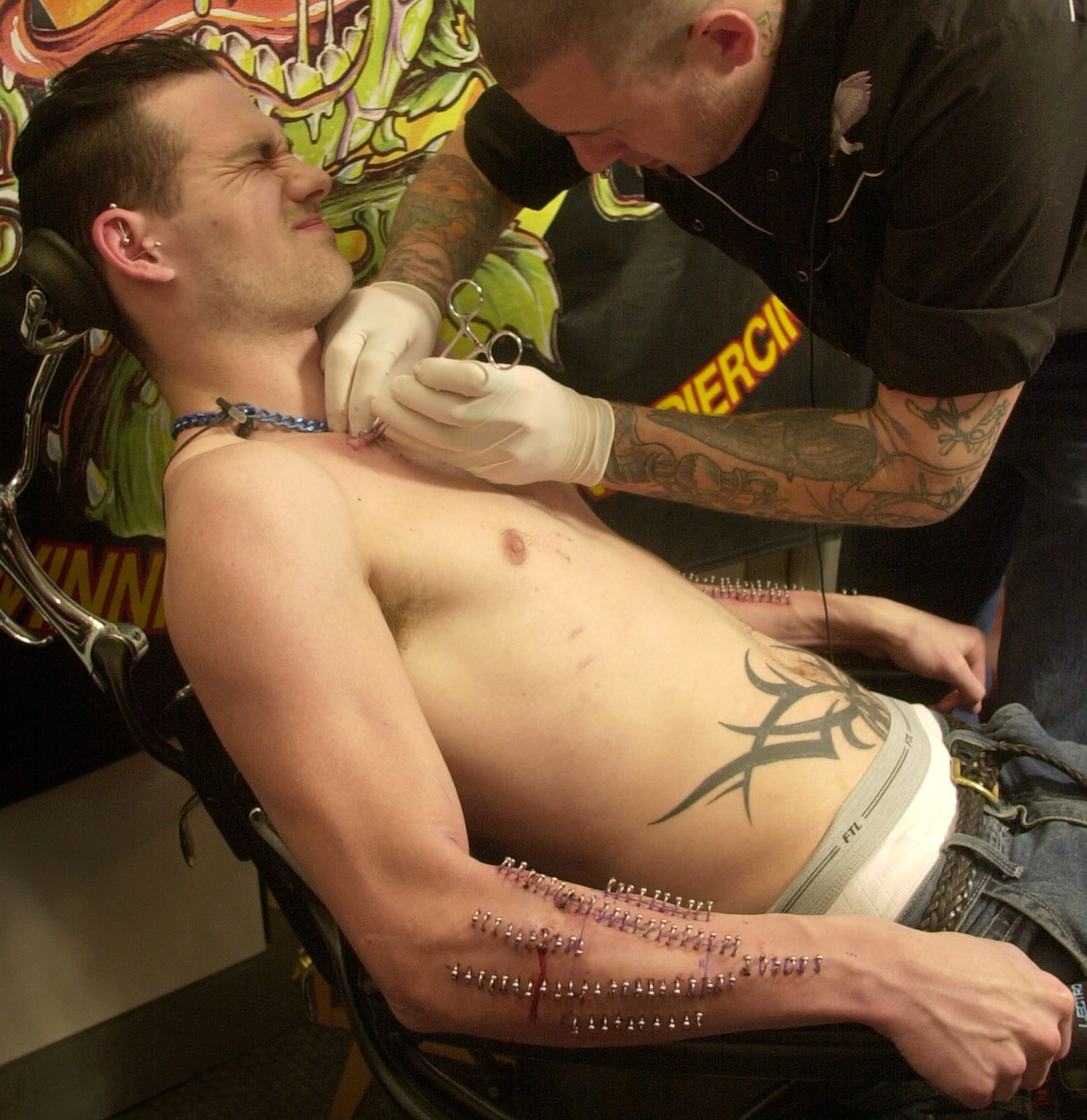 En el piercing en la ceja, en la aleta de la nariz, en el ombligo, en los labios (de arriba, de abajo e inferiores), en las orejas y en otros lugares en los que solo pensarlo da dolor, que es lo normalito. Luego están los enganchados que empiezan y no paran de colgar chatarra al cuerpo. Otro arte. Al margen del sentido y significado simbólico-cultural, etnográfico-artístico y hasta antropológico que el uso de estos adornos tienen. En las tribus centroafricanas, de Oceanía, la Polinesia y la Micronesia, me refiero.
