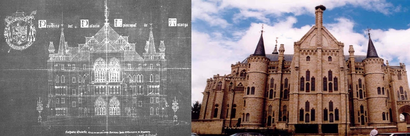 Pero aquí y ahora quiero referirme “sólo” a las desavenencias producidas durante la actuación de Gaudí en Astorga, magnífica ciudad de la provincia de León, donde el maestro quiso, que su Palacio Episcopal encajara, pero también contrastara, con el resto de los edificios de su entorno. El palacio hoy día se recorta en el cielo como un muro de granito blanco con torreones, balcones, ventanas, vidrieras y otros detalles que él gustaba de incluir en todas sus creaciones, aunque algunos de esos detalles desaparecieron del proyecto por las disputas que surgieron durante la ejecución de la obra.