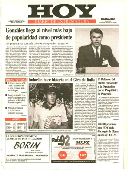 .- El ciclista navarro Miguel Indurain gana la 75 edición del Giro de Italia, primer español que lo consigue.
