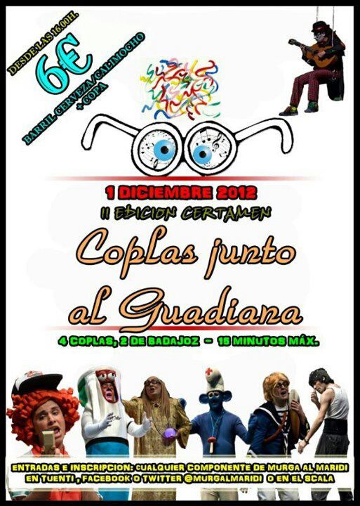 Por eso motivo, la murga Al Maridi vuelve a recuperar el concurso que se celebrase el año pasado por primera vez, Coplas junto al Guadiana. Pero este año se celebra en un lugar diferente, en el pub Scala.