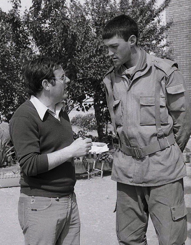 Una de las personas que más ha conocido el Cefot de Cáceres ha sido Carlos Tejado del Arco. Él trabajó 32 años en la oficina de Correos y Telégrafos del centro de instrucción y en el año 2001 publicó el libro sobre esta institución titulado ‘Santa Ana, 40 años de historia’. Natural de Hervás, pasó casi toda su vida en Cáceres en donde fue colaborador deportivo en Radio Nacional de España y en la COPE. En una imagen que nos ha cedido para este blog el fotógrafo Juan Guerrero, le vemos en los años setenta entrevistando a un jugador de baloncesto que hacía la mili en Cáceres.
