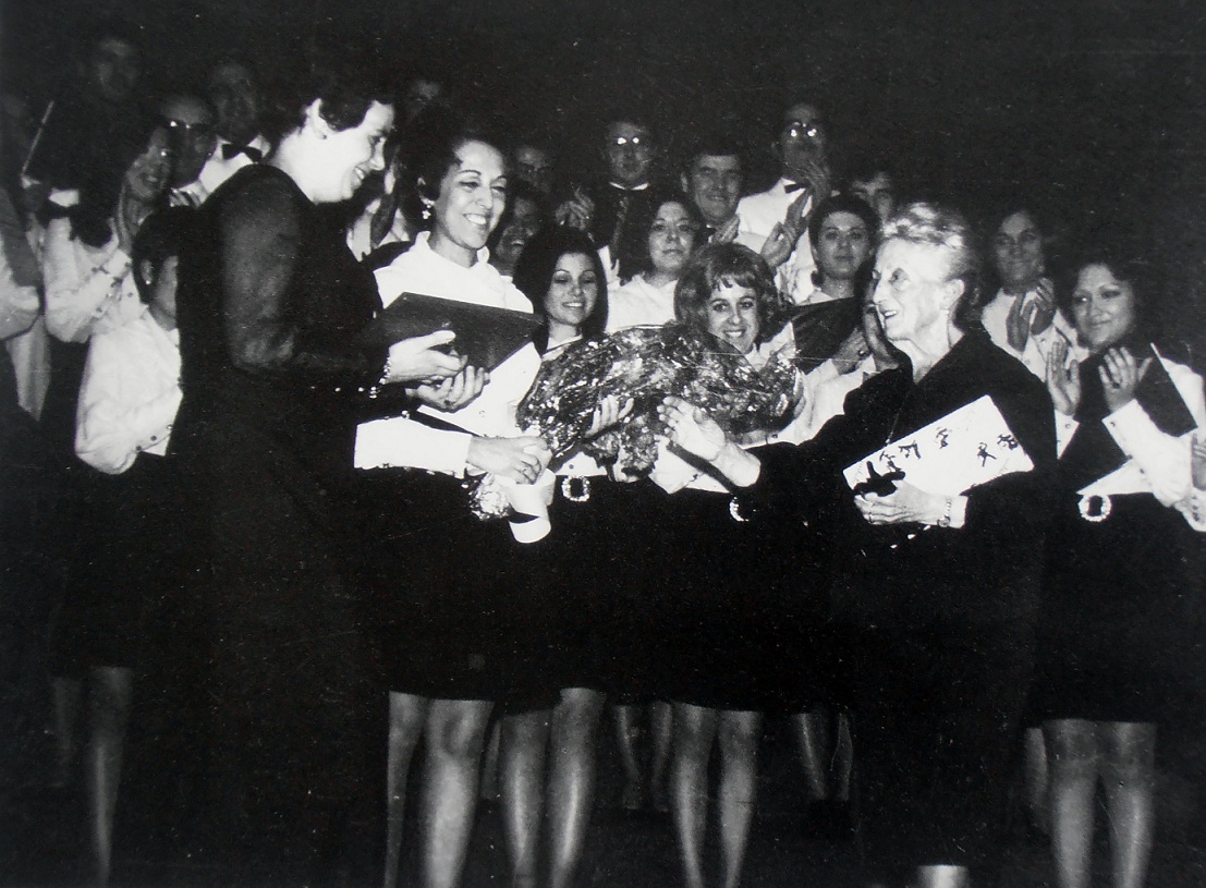 La imagen siguiente, del fotógrafo Múñez, es del Orfeón Cacereño en los años setenta. Tiene que ser a principios de esa década ya que Trinidad León entrega una placa a Angelita Capdevielle que murió en 1972 con 82 años. Angelita Capdevielle hizo revivir el folclore cacereño, haciendo famosa la canción de El Redoble.
