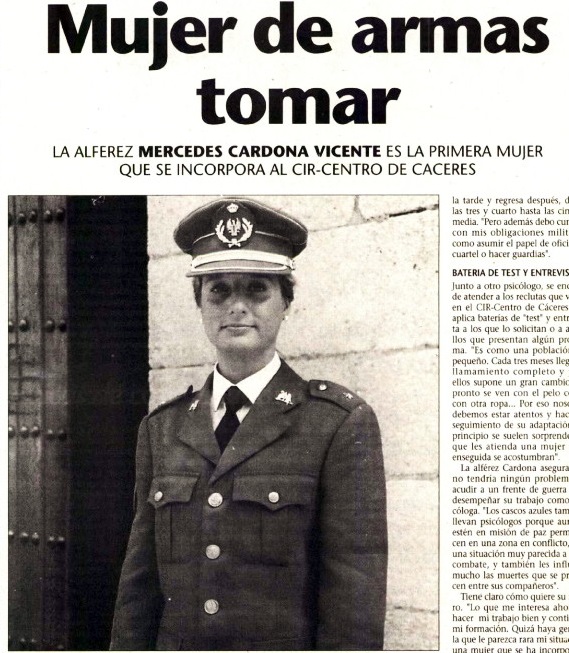 La incorporación de la mujer en el Ejército se comenzó a notar en 1994 en el CIR ‘Centro’ de Cáceres al llegar a este destino la psicóloga Mercedes Cardona Vicente con el mando de alférez; era la primera mujer militar en Cáceres. La novedad hizo que la periodista Marta Ruiz de Apodaca la entrevistara para el Diario HOY. Fue la portada del suplemento del domingo del 12 de junio de 1994.