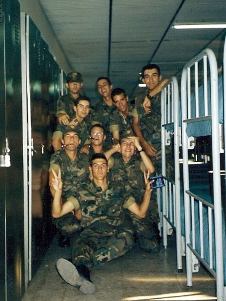Javier Cifuentes con unos compañeros de mili en el pasillo de una compañía, entre las camas y las taquillas.