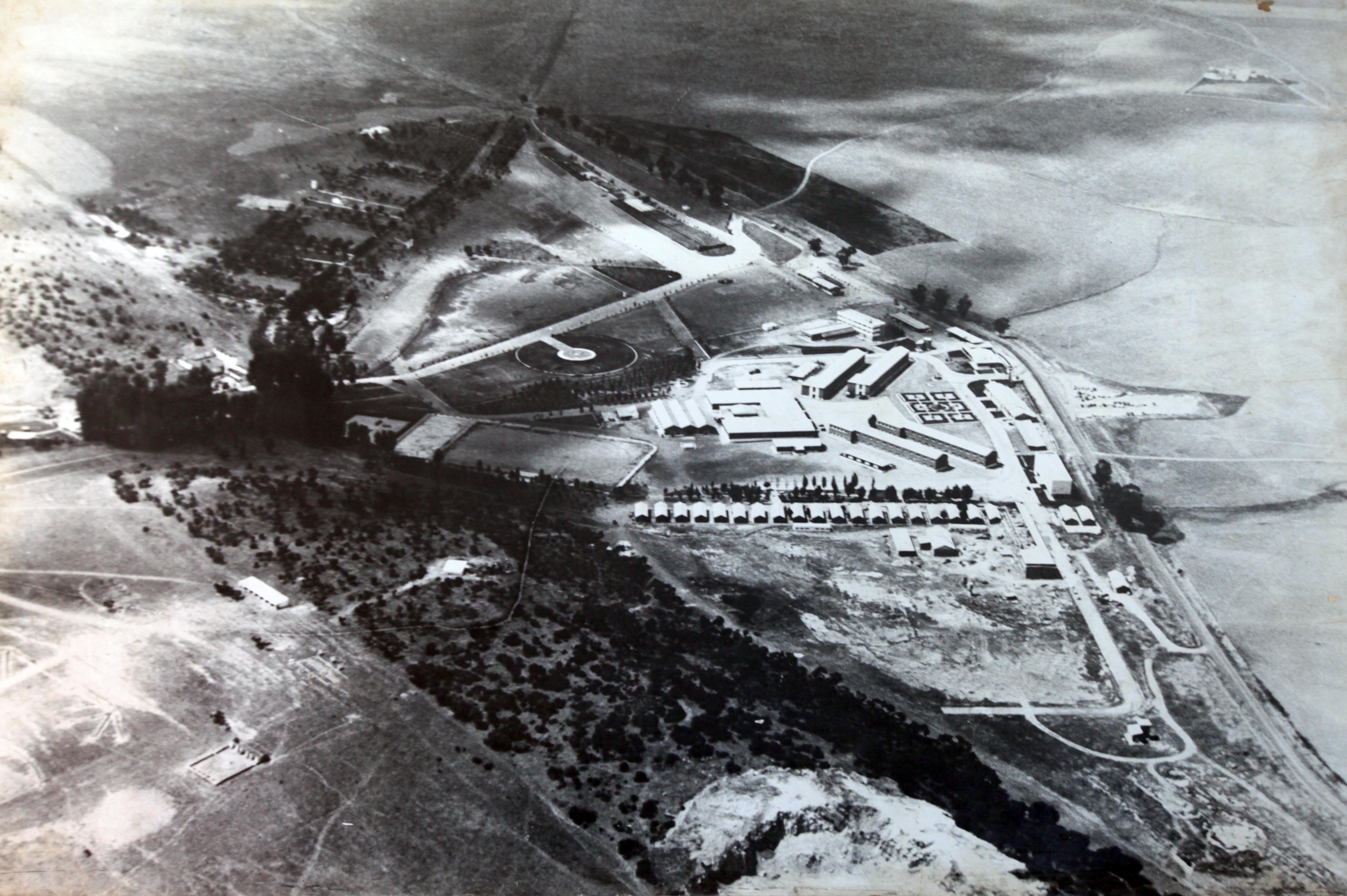En una pared de la entrada de la Oficina de Apoyo al Personal de Tropa, en las instalaciones del CEFOT de Cáceres (antes CIMOV y CIR), se encuentra colgada esta fotografía aérea que muestra cómo era el Campamento Santa Ana en los años setenta.