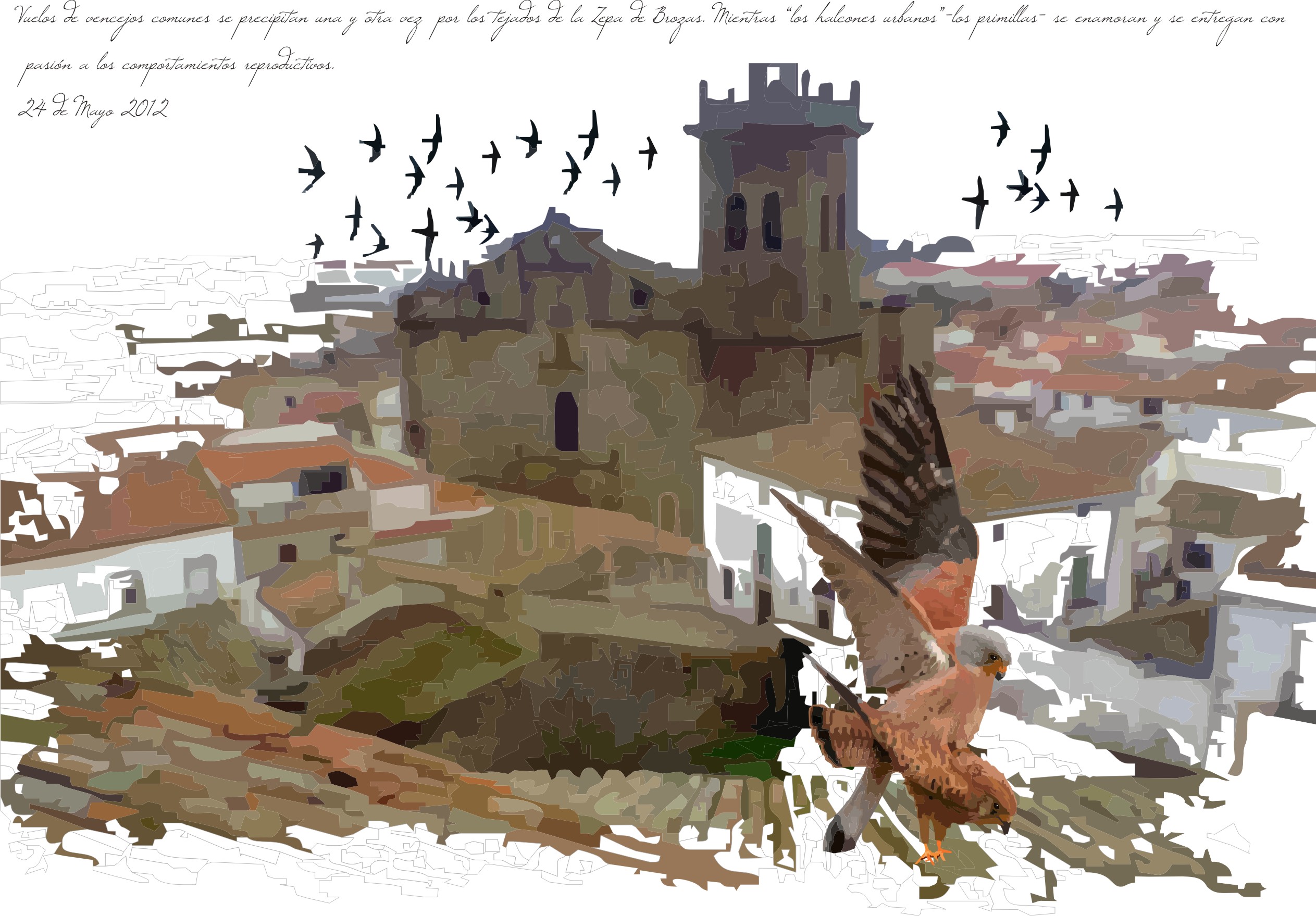 Este cernícalo, también está llegando en este instante a nuestros pueblos y ciudades. Nada más arribar se asientan en sus colonias, con forma de catedrales, conventuales, iglesias, y demás edificios históricos,-decir que para ellos son enormes moles graníticas perfectas para nidificar-. Su tarjeta de presentación son sus característicos sonidos:  “quii-quii” o “quii-quiqui” que sonorizan todo el cielo urbano. Les gusta hacerse de notar.