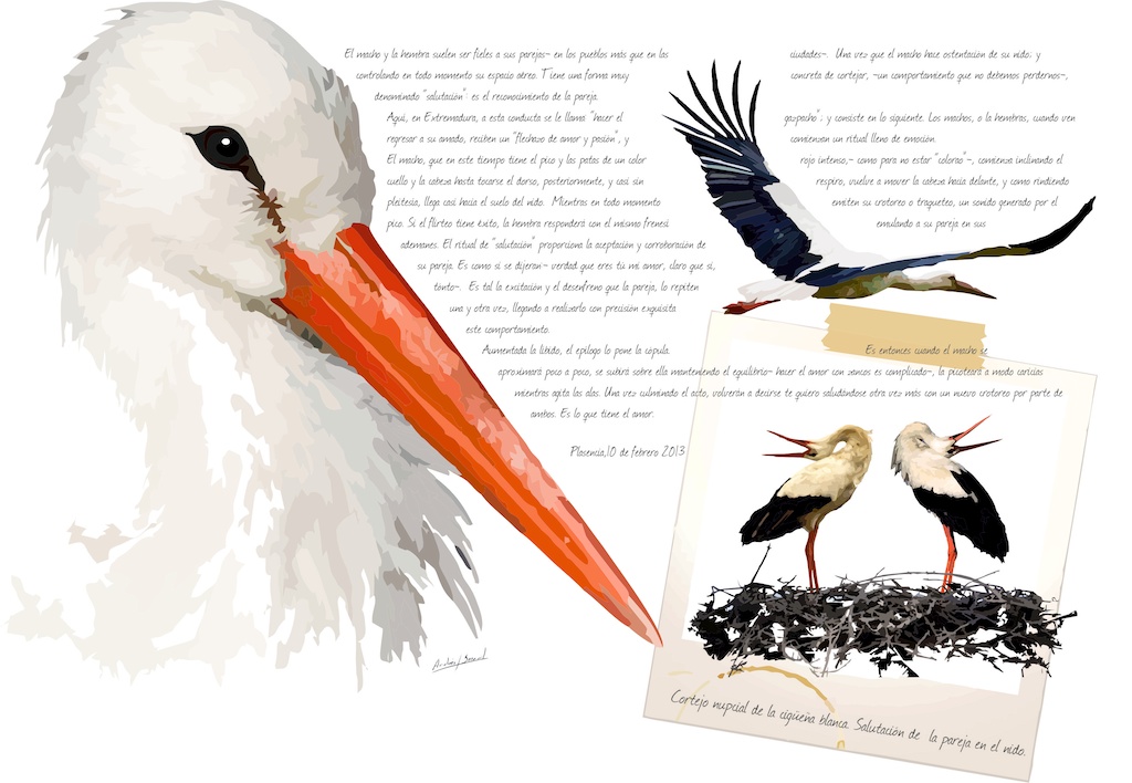 El macho, que en este tiempo tiene el pico y las patas de un color rojo intenso,- como para no estar “colorao”-, comienza su actuación inclinando el cuello y la cabeza hasta tocarse el dorso, posteriormente, y casi sin respiro, vuelve a mover la cabeza hacia delante, y como rindiendo pleitesía, llega casi hasta el suelo del nido.  Mientras en todo momento emite su “crotoreo”o “traqueteo”,-un sonido generado por el pico-.  Si el flirteo tiene éxito, la hembra responderá con el mismo frenesí, emulando a su pareja en sus ademanes. El ritual de “salutación” proporciona la aceptación y corroboración de la pareja. Es como si se dijeran:-… verdad que eres tú mi amor, claro que si, tonto. Te quiero, y yo más, no yo más…-. Para que luego digan de San Valentín. Es tal la excitación y el desenfreno que la pareja, lo repite una y otra vez, consiguiendo ambos ejecutarlo con una precisión exquisita.