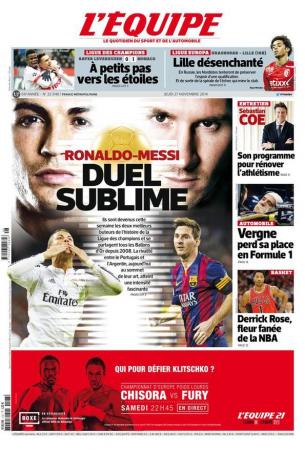 Hace tiempo que la prensa deportiva de este país está enrolada en la peligrosa deriva del periodismo de bufanda. Todo por las ventas, justifican. Es lo que el público quiere, señalan. La polémica, el enfrentamiento, el morbo…todo eso vende. Tenemos la fortuna de contar con, posiblemente, los dos mejores futbolistas del mundo, pero en lugar de disfrutar de este privilegio, muchos se empeñan en buscar enfrentamientos absurdos, polémicas estériles y comparaciones ridículas ¿Llegará el día en el que veamos en un diario español una portada dedicada a la gesta de un deportista, ojo, no solo futbolista, de otro país? Nos tememos que esta portada de L´Equipe, periódico francés, tardará un tiempo en poder verse por aquí.