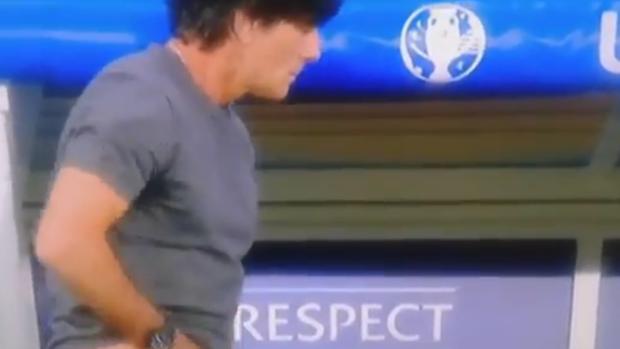 La segunda imagen tiene que ver con el tratado de tocamientos, excrecencias y guarrerías diversas protagonizadas por el seleccionador alemán, Joachim Löw. Sorprende que un tipo ya experimentado, sabedor de que en un partido de fútbol, Gran Hermano Televisión te vigila, que no puedes ni hablar sin tener la boca cubierta por la mano, haya sido tan pardillo al pensar que no le iban a pillar con las manos en la masa…nunca mejor dicho. Cualquiera es el valiente que se coloca a su lado en el comedor de la selección alemana de fútbol…