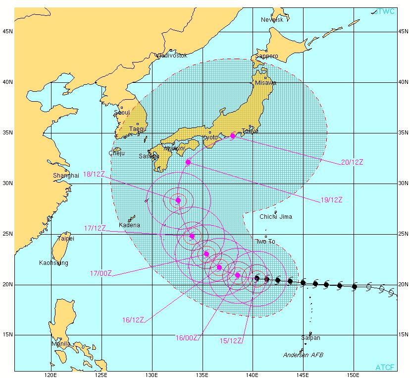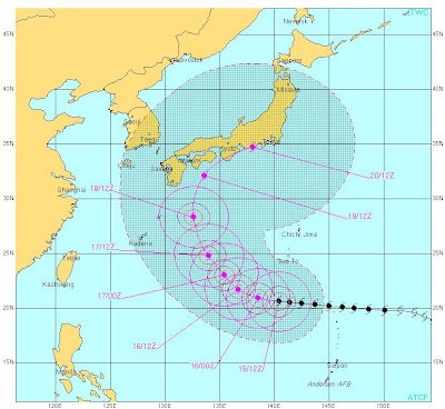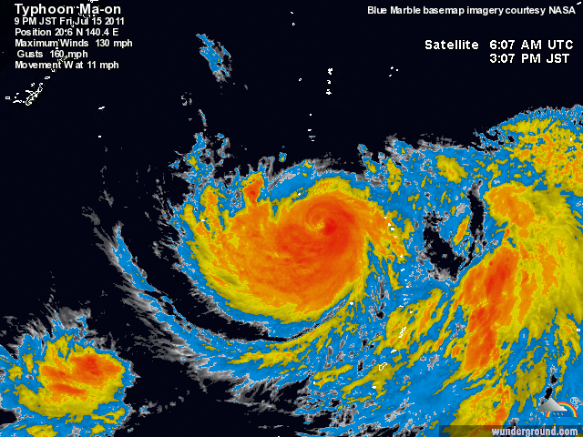 Hace pocas horas que el tifón MA-ON alcanzó la categoría 4 con vientos sostenidos de 220 km/h. Los pronósticos continúan apuntando a que MA-ON chocaría con la isla de Japón y recorrería la isla desde el Sur hacia el Norte debilitándose.
