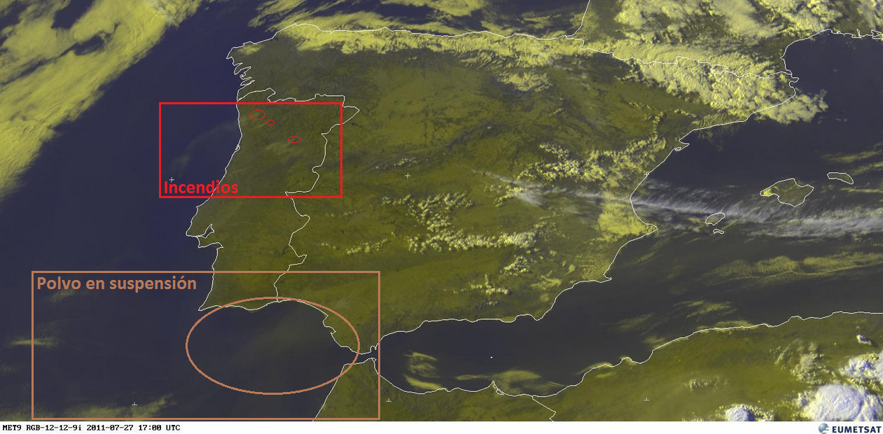 Destacar que con las altas temperaturas que hemos tenido hoy se han activado algunos incendios hacia el Norte de Portugal. También vemos un poco de polvo en suspensión al Suroeste de la Península.
