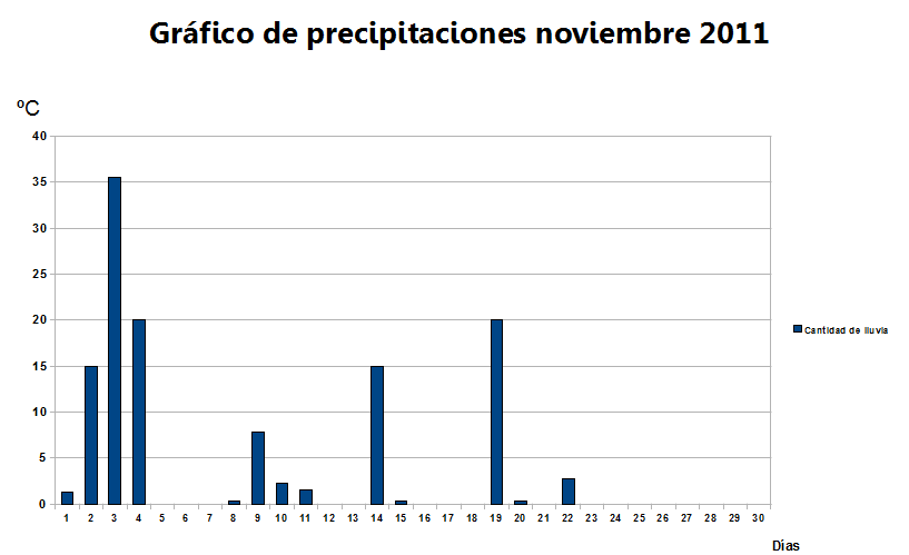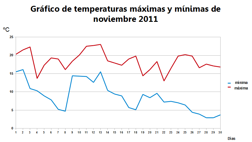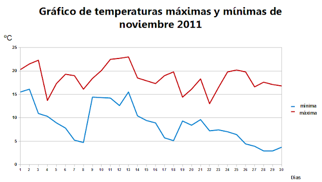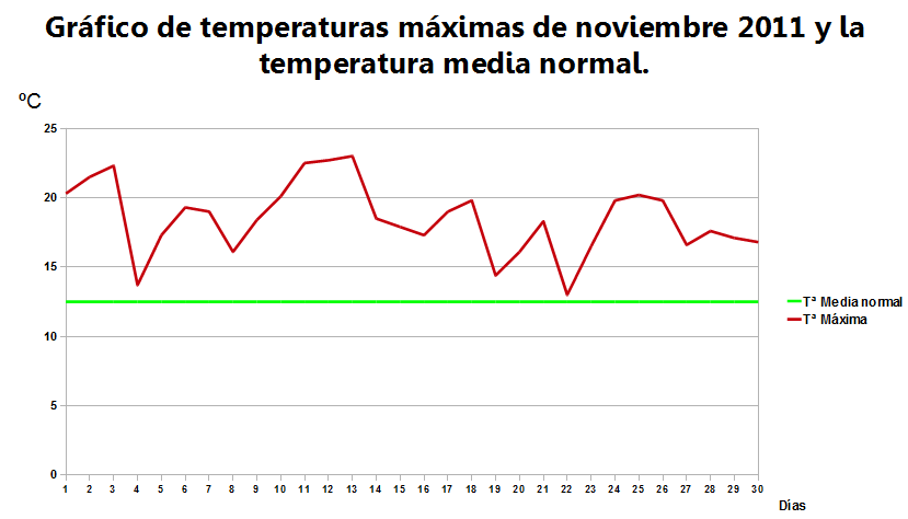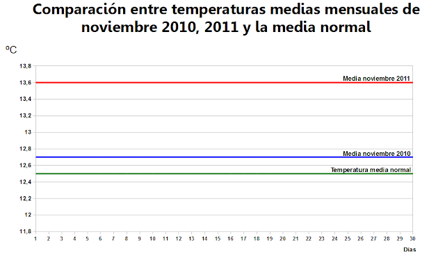 Como curiosidad y disponiendo de datos de mi estación desde principios de 2010, he realizado una comparación entre la temperatura media de noviembre 2010, noviembre 2011 y la media normal. Como vemos noviembre 2011 ha sido más cálido que el mismo mes en 2010, ambos superando la media.