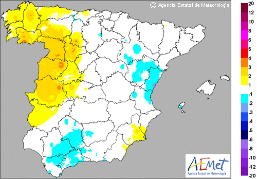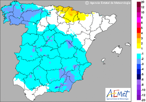 Obviamente las temperaturas máximas bajarán por la presencia de cielos cubiertos, no tenemos sol y por tanto no suben las temperaturas. La mínimas subirán también por la presencia de las nubes, por lo que apenas tendremos heladas en la región.