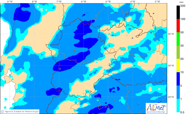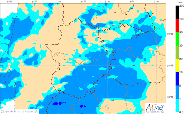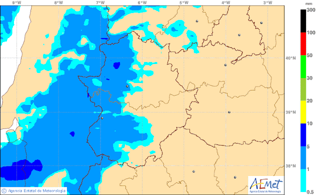 Durante la próxima madrugada ya empezaremos a ver algunas lluvias por el oeste, pero será sobre todo por la mañana cuando esas precipitaciones pueden ser algo más intensas. Las más abundantes en el sur de la provincia de Badajoz donde se acumularán cantidades de unos 20mm. En el resto entre los 5mm y los 15mm.