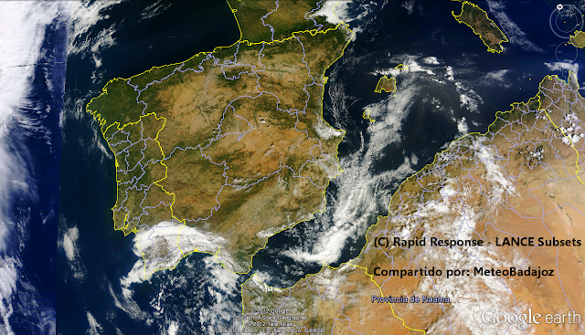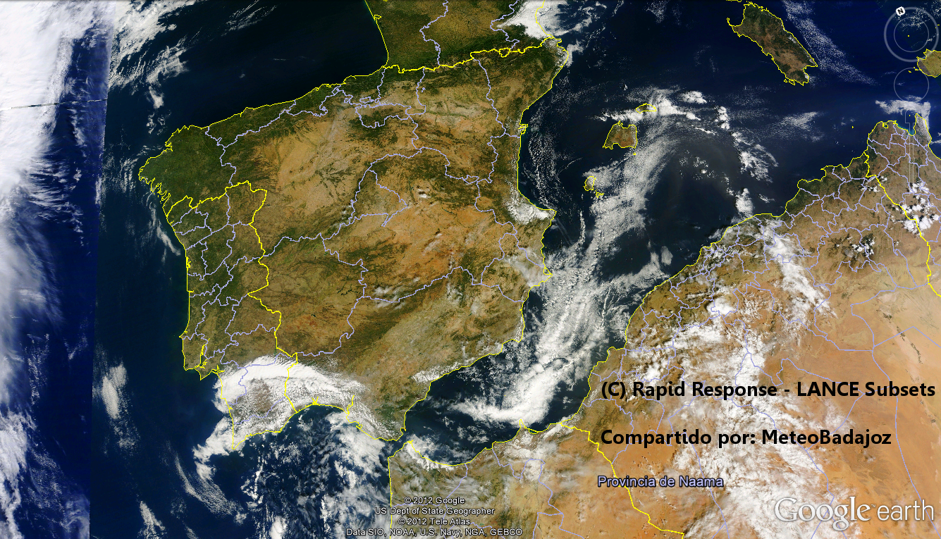 En esta imagen del satélite TERRA, tomada en la jornada del viernes 5 de octubre de 2012, podemos apreciar la poca vegetación que actualmente existe en la Península Ibérica. Tan solo con la excepción de los extremos norte y noroeste, donde las precipitaciones han sido algo más frecuentes que en el resto del país.