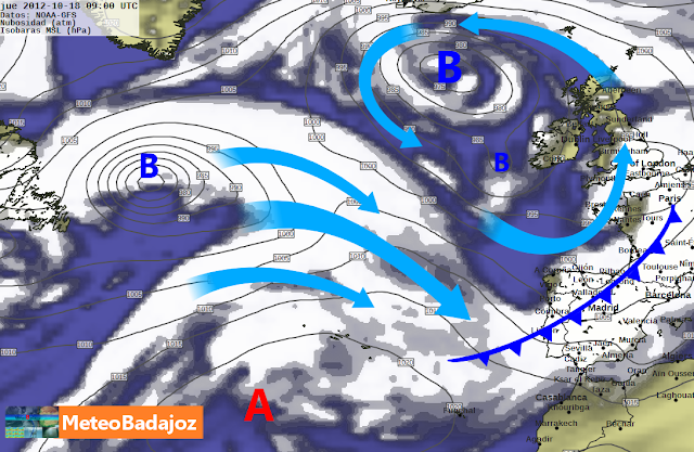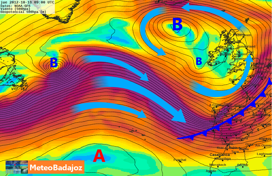 Las consecuencias que ésto tiene es que las borrascas, (que normalmente pasan muy al norte de Europa y cuyos frentes sólo afectan al noroeste del continente y de forma más débil a España) comiencen a pasar (o al menos a acercarse) a la península. Con todo esto, lógicamente los frentes que afecten a la península serán más jugosos, más activos y lo que es más importante, ¡más frecuentes!.
