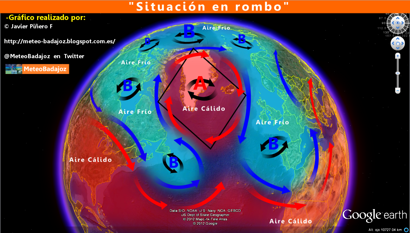 Como podemos comprobar en la imagen superior, esta situación consiste en que un área de altas presiones (anticiclón) que se posiciona a la misma latitud que Groenlandia o incluso en el mismo Ártico, y con sustento en altura (con una burbuja de aire más cálido que la que le rodea). Esto permite que el chorro polar se bifurque de forma que aparecen dos ramales, uno que se desvía hacia el sur, y otro que lo hace hacia el norte. Y como ya sabemos, el chorro polar es una corriente de viento a unos 10Km de altitud que va moviendo los diferentes centros de acción, de forma que las borrascas van llegando por el oeste. Pero en esta configuración, las borrascas rodean a la masa de aire cálido en altura.