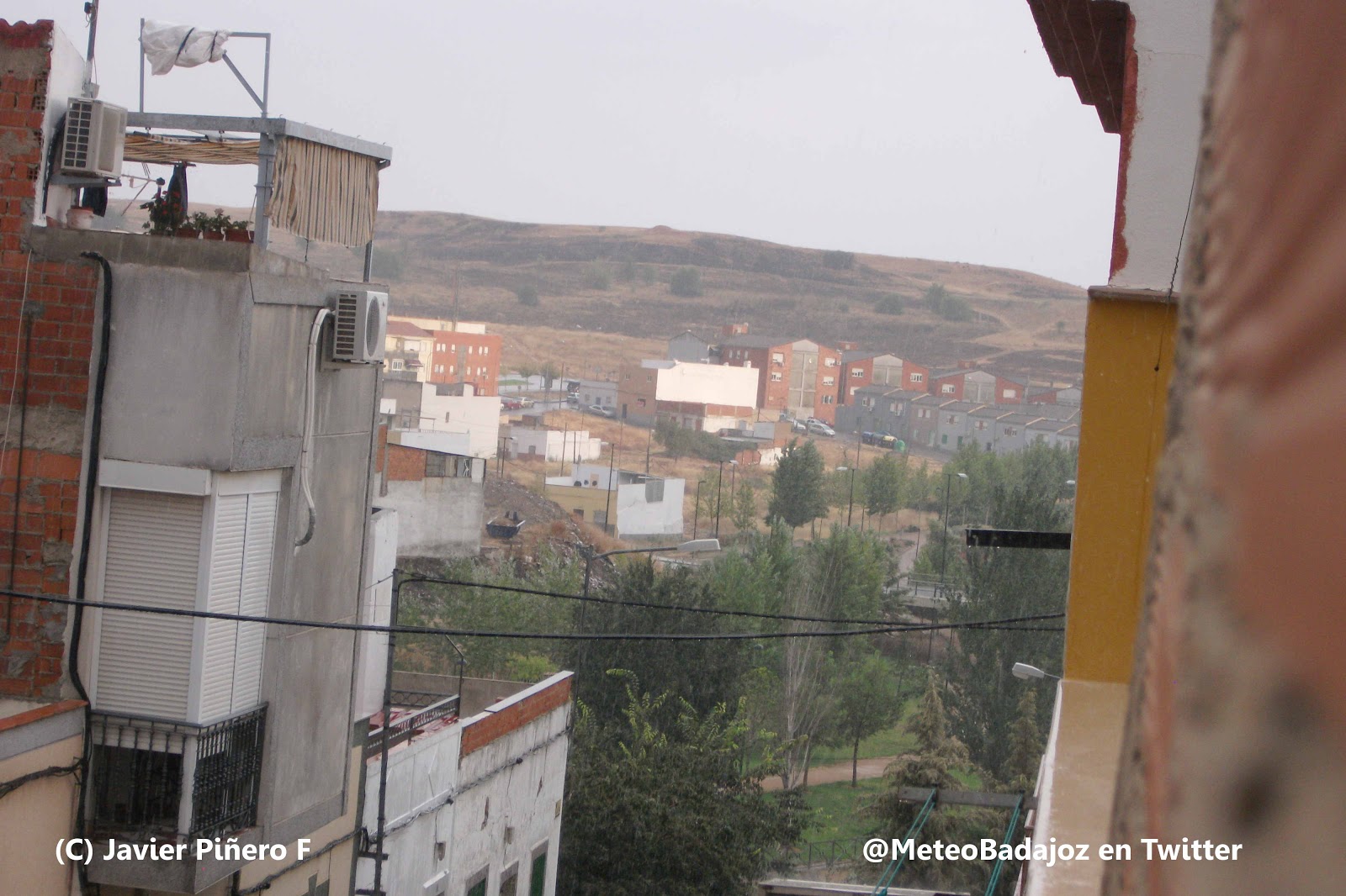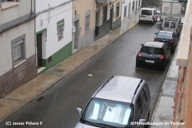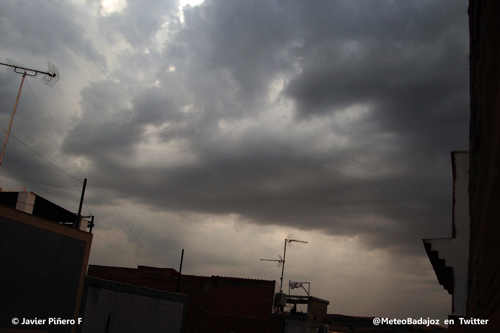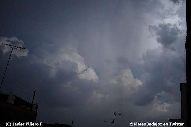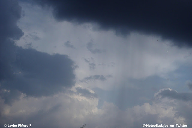 Mirando hacia el sur-sureste, esa línea de nubes de evolución que veíamos antes estaba ya bastante más desarrollada, con pequeños núcleos tormentosos que se acercaban hacia Badajoz capital. Mirad la cortina de precipitación de las fotos de abajo… ¡Impresionantes!