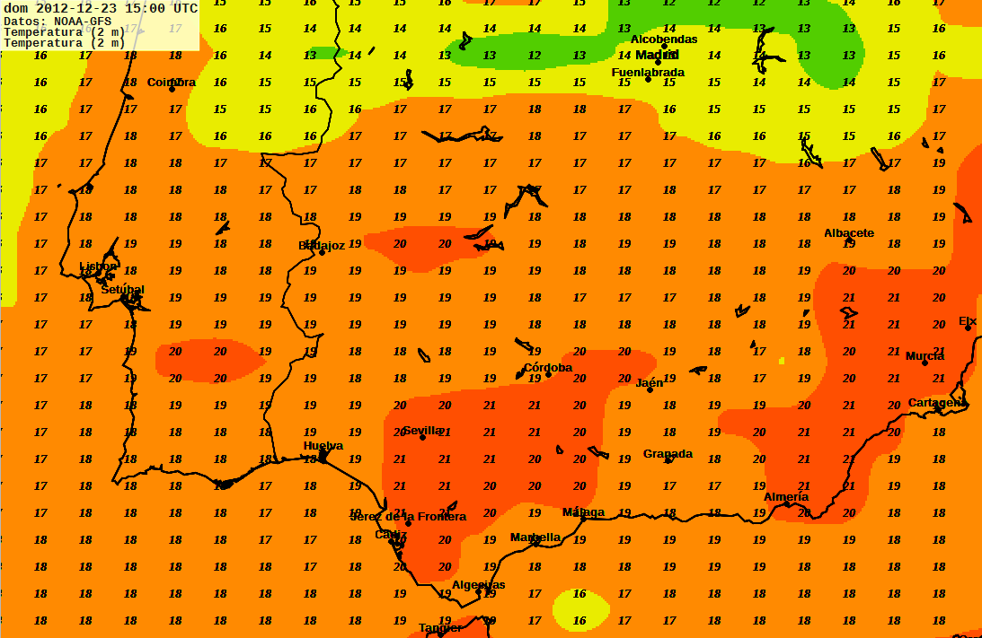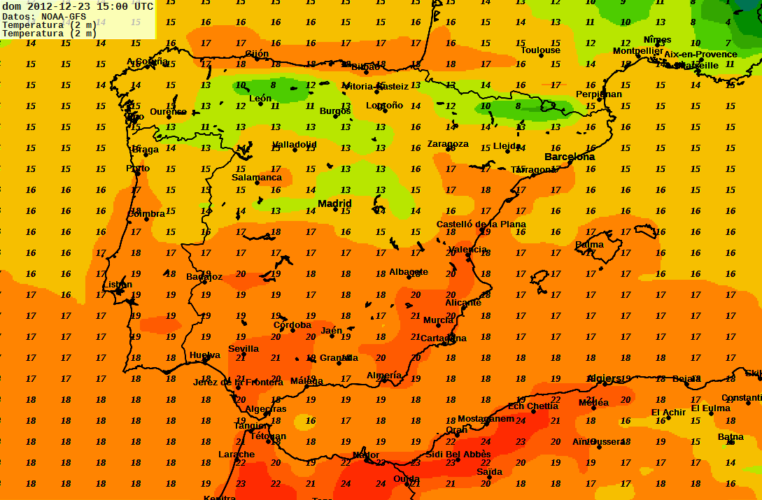 Y este es el mapa de temperaturas a nivel de la superficie terrestre para el domingo 23 de diciembre, a las 15h UTC (16h en la península). Como podemos comprobar, temperaturas incluso por encima de los 20ºC y hasta 21ºC.