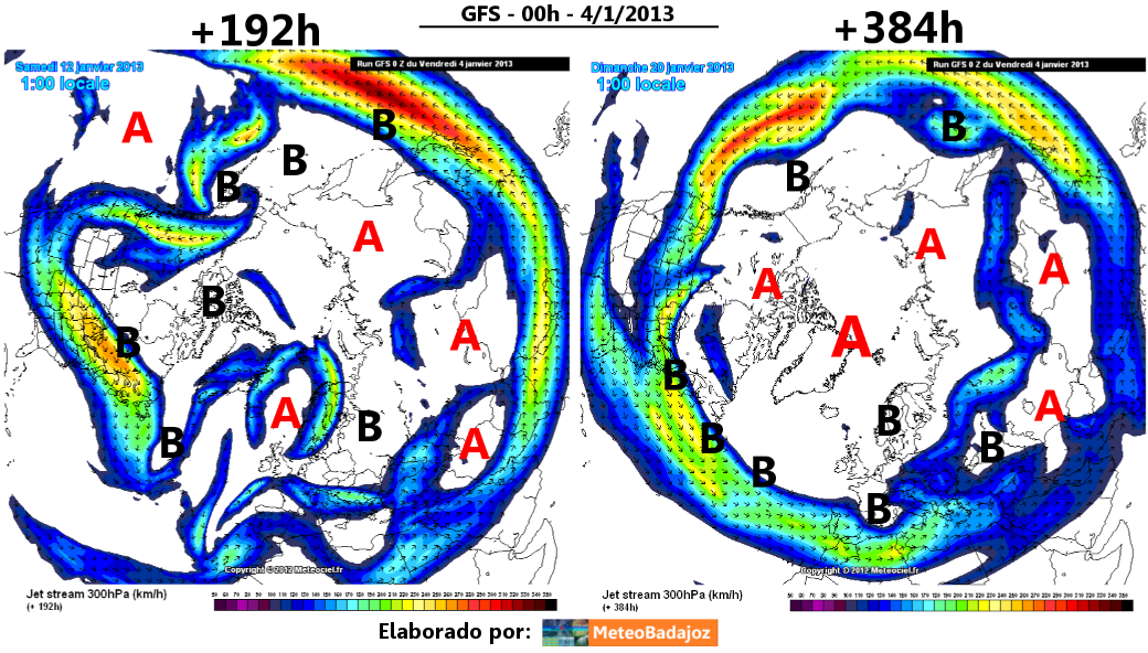 Pero fijémonos ahora en el mapa de la derecha, a muy largo plazo (ya lo sé), pero es que es tremendo y es un ejemplo en toda regla de lo que se podría configurar para esas fechas. Observamos que una extensa región de altas presiones que ocuparía (en principio) gran parte de las latitudes altas del hemisferio norte, desplazando el chorro polar hacia latitudes mucho más bajas. Circulación casi perfecta, el chorro polar adquiere una forma circular a vista global del hemisferio con prácticamente ningún ramal de éste por las zonas árticas… Mirad también la circulación del chorro en el Atlántico…. ¡menudo flujo de oeste! ¡Qué pasillo! Brutal!