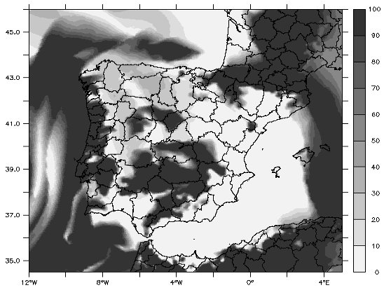 El mapa superior muestra el porcentaje de nubosidad sobre la Península previsto para mañana sábado a las 13h del mediodía. Los colores van de más claros (el blanco) a más oscuros (el gris oscuro), indicando el porcentaje de nubosidad existente con la referencia de la escala de colores de la derecha.