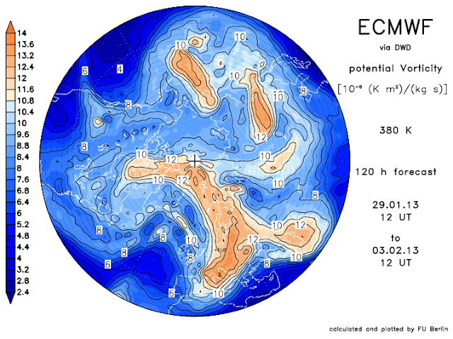 Una de las claves que debemos conocer para poder confirmar la llegada de esa masa de aire frío es observar el mapa superior que corresponde a un parámetro poco escuchado. Os muestro este mapa (poco habitual) porque os voy a intentar explicar su interpretación muy brevemente y para que todo el mundo lo entienda. El mapa superior dibuja un parámetro que no se suele mencionar mucho a la hora de predecir el tiempo a medio plazo, ya que es un poco complicado de entender e interpretar, de hecho, doy fe de ello (como aficionado) porque hasta hace poco desconocía su significado, pues después de mucho buscar y mucho leer (todo en inglés) he logrado entenderlo. Se trata de la vorticidad potencial (PV) que en términos físicos es una medida de rotación local de un fluido. A parte de esto, para que ustedes lo entiendan, éste parámetro nos da muchas pistas de dónde se pueden localizar los centros de acción (anticiclones y borrascas) a lo largo de una región determinada y a nivel de la superficie terrestre. En este caso, tenemos el mapa de vorticidad potencial en el Hemisferio Norte, donde vemos valores elevados de vorticidad potencial en gran parte del centro y sur de Europa, lo que nos está indicando la presencia de centros de bajas presiones (borrascas) y masas de aire frío, mientras que vemos anomalías bajas de vorticidad potencial en las Islas Azores, que nos indica la posible existencia de una región de altas presiones (anticiclón) con aire más cálido.