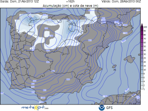 Acumulación de nieve y cota para el domingo 28 de abril de 2013, a las 06h – Modelo GFS