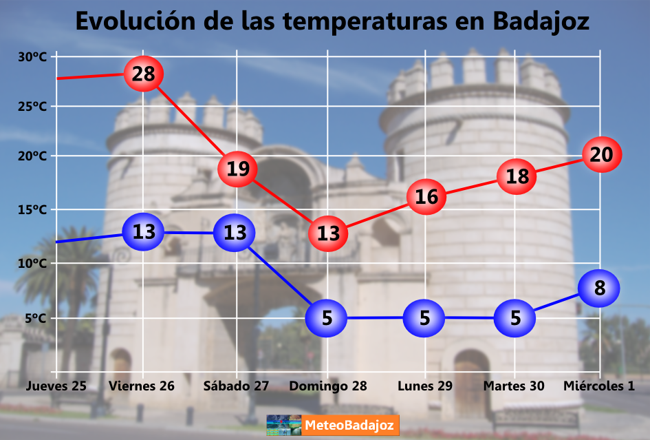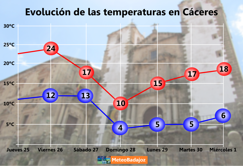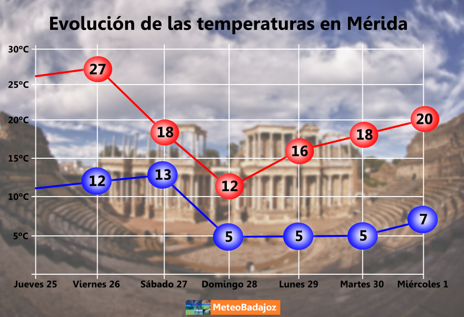 A continuación, veamos la evolución de las temperaturas máximas y mínimas previstas para los próximos días en tres ciudades extremeñas: Cáceres, Mérida y Badajoz.