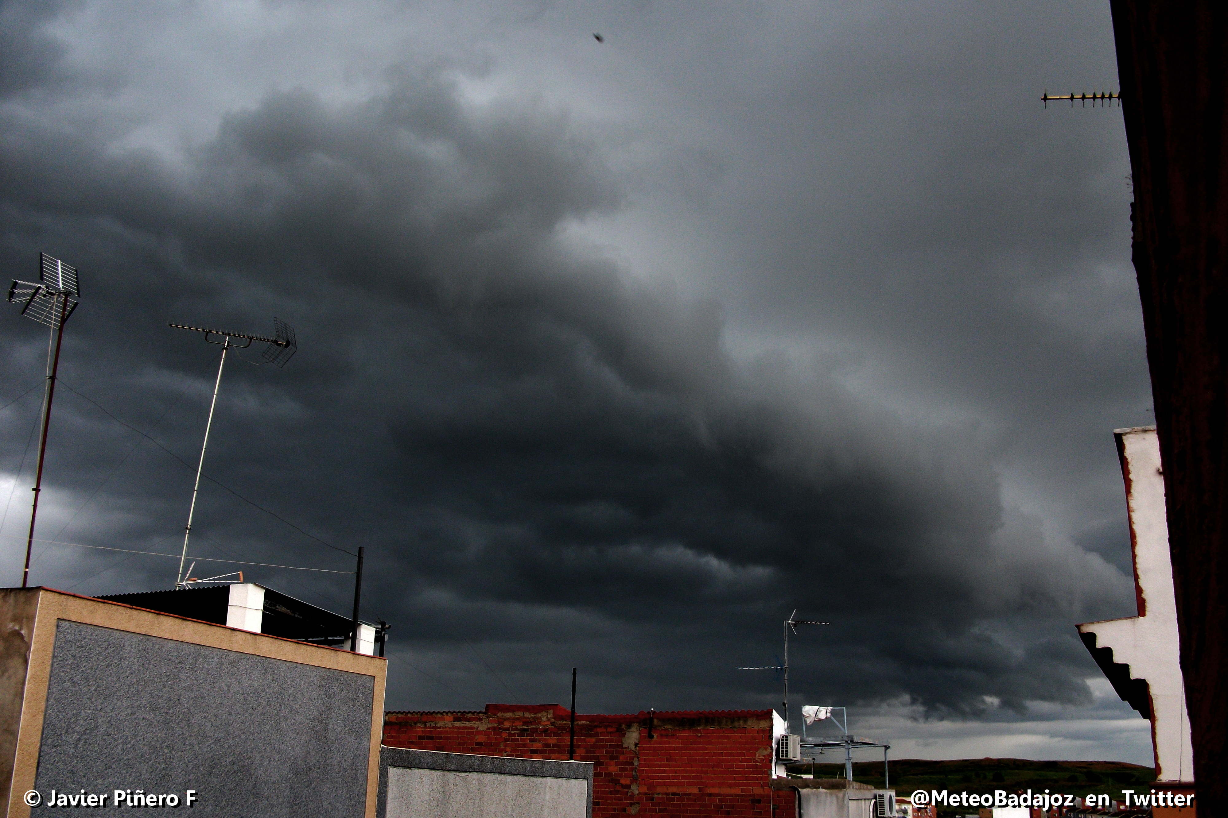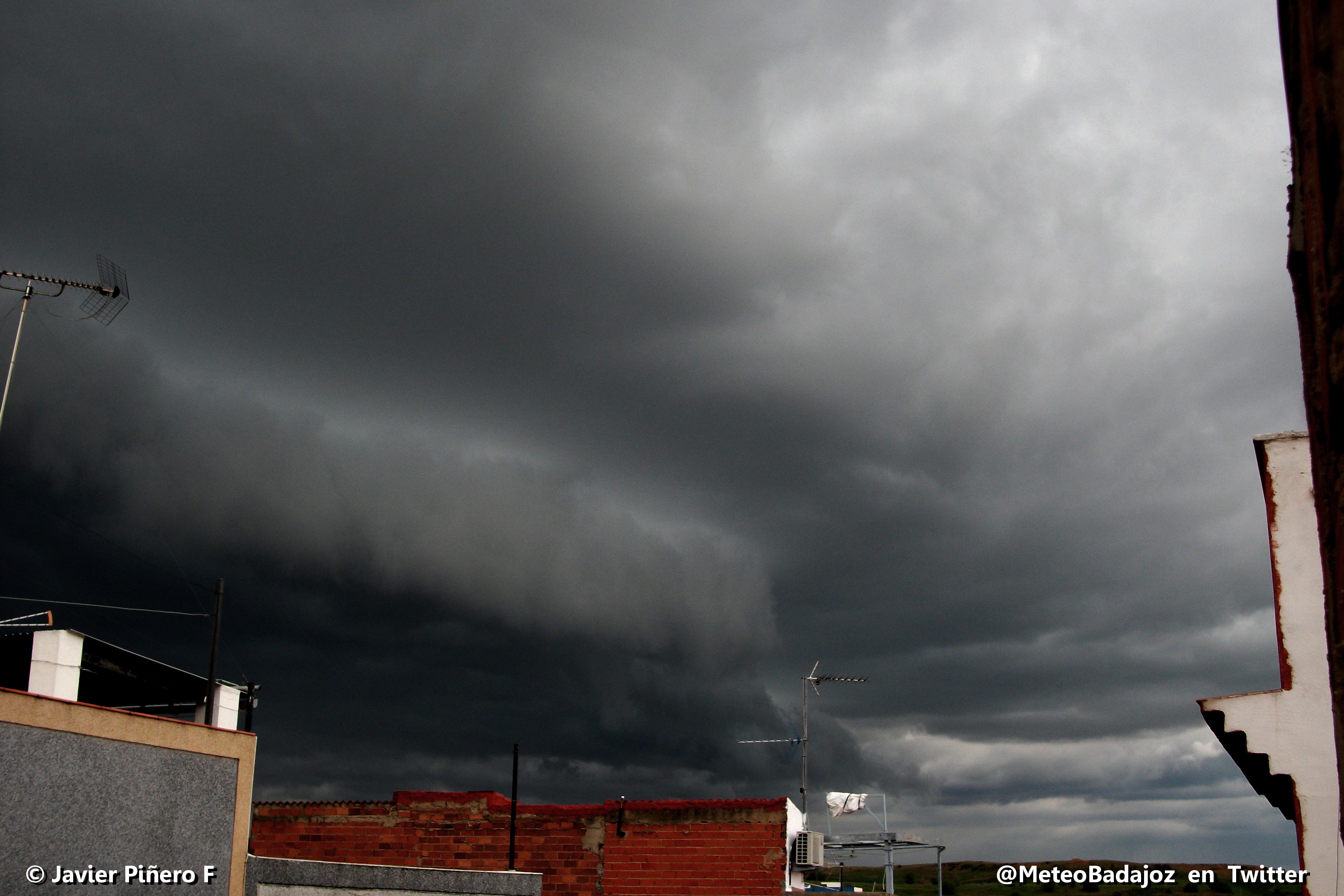 La tarde del lunes nos está dejando la formación de bastantes chubascos, e incluso con algunas tormentas, por casi toda Extremadura. El centro de la borrasca se encuentra sobre el centro peninsular, y poco a poco se va desplazando hacia el oeste. A medida que lo hace, va reactivando numerosos chubascos por gran parte de la región, e incluso con tormentas por el norte de la provincia de Cáceres. En Badajoz hemos podido observar (a eso de las 16:30h de la tarde) esta espectacular formación nubosa asociada a uno de los chubascos que nos han estado afectando hoy por las Vegas bajas del Guadiana.