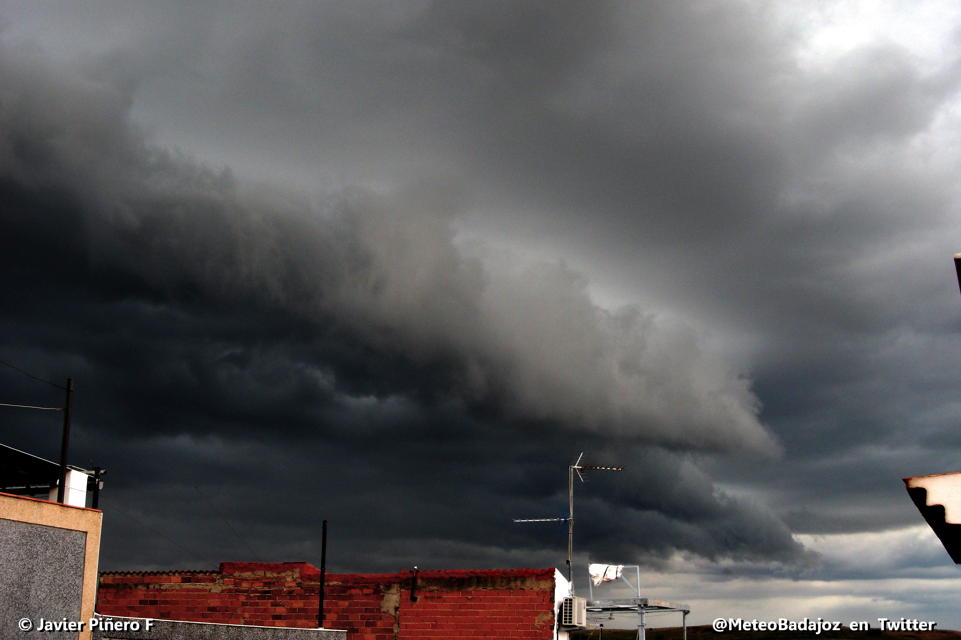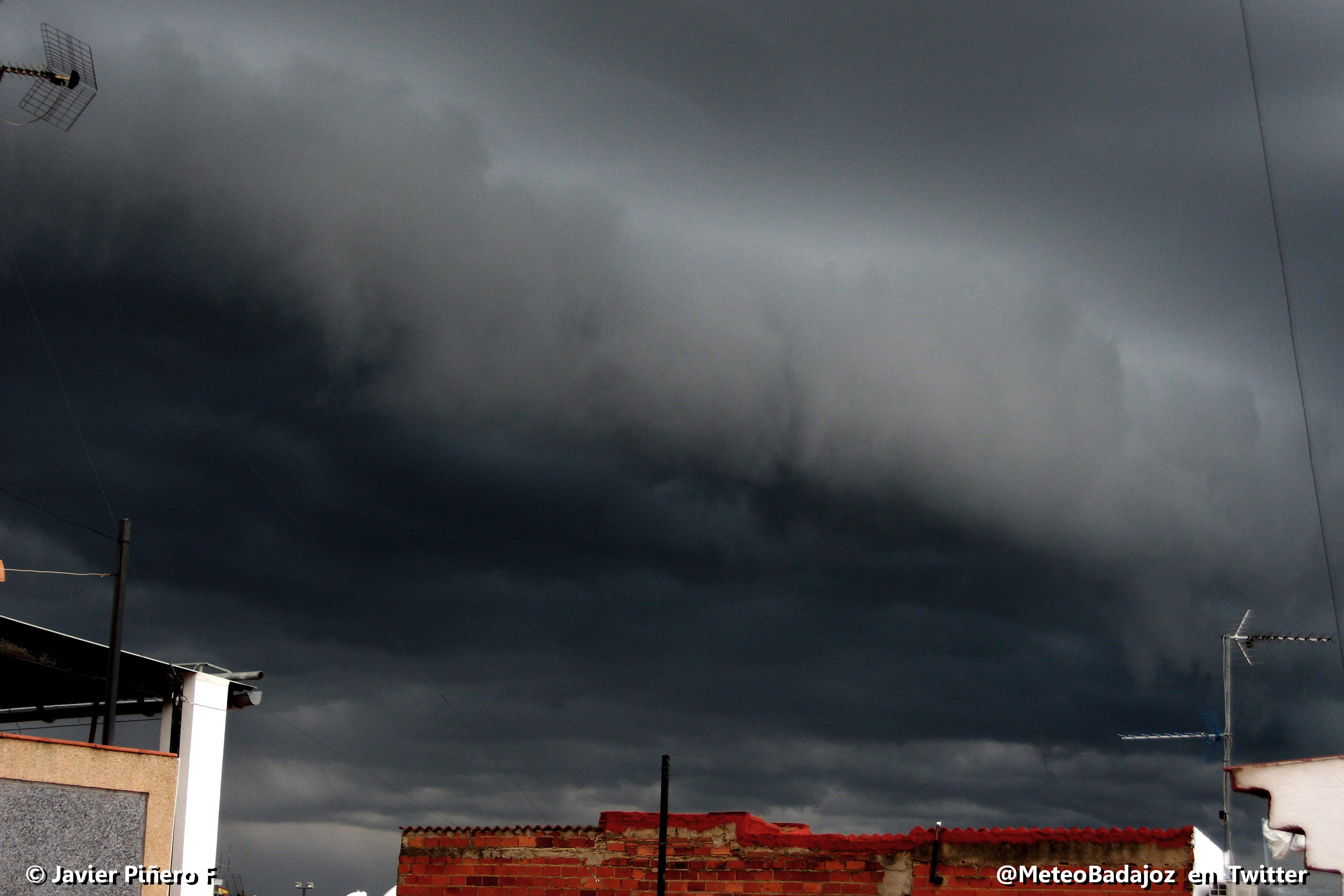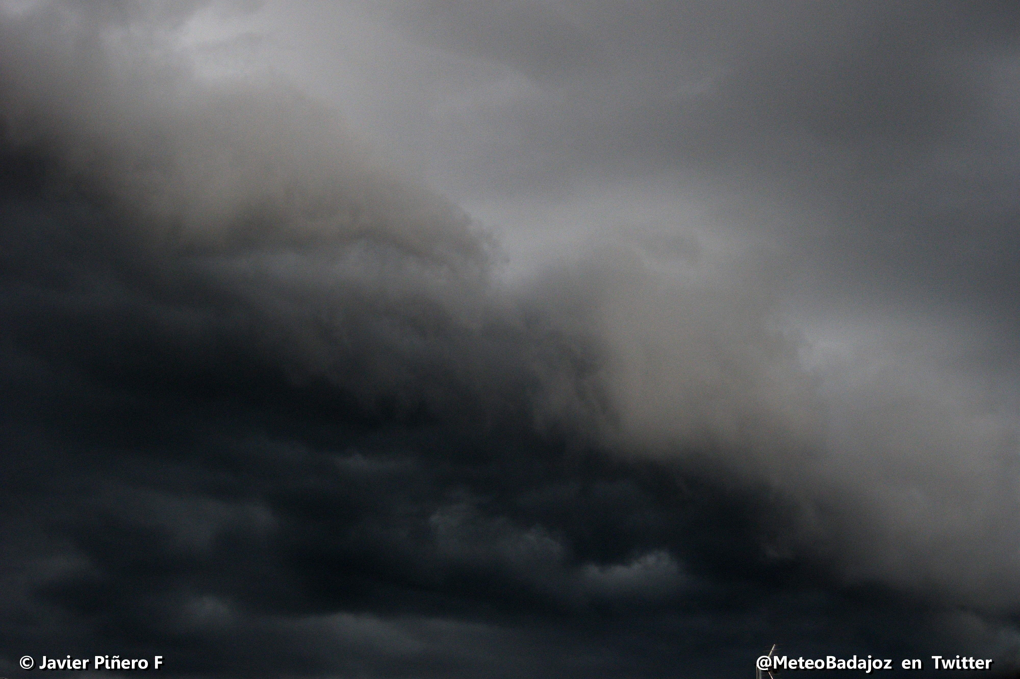 Las formaciones nubosas que se observan en la base de la nube se conocen con el nombre de “shelf cloud” y hace referencia a esas formas que tienen las nubes medias-bajas, a modo de cuñas, que se encuentran en los bordes delanteros de avance de la tormenta. En este caso no hemos tenido tormenta en Badajoz, pero sí se han producido algunas rachas de viento moderadas y muy frías, justo al cruzar esta primera parte de la nube. La lluvia tampoco ha sido demasiado destacable, un breve aguacero con moderada intensidad y poco más. De hecho muchos ni se habrán enterado, pero los que estamos siempre atentos al cielo hemos podido disfrutar de esta espectacular nube.