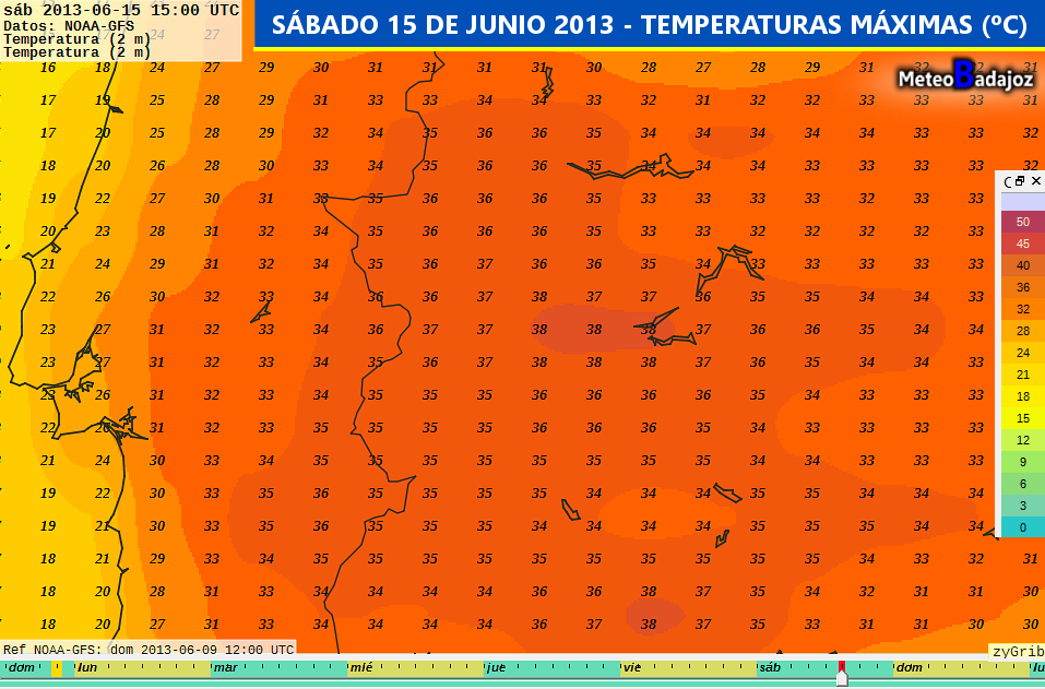 Lunes 10 de Junio 2013. Poco ha durado este pequeño paréntesis de temperaturas frescas y lluvias que hemos tenido durante el pasado fin de semana, porque para los próximos días las temperaturas iniciarán un progresivo e importante ascenso, que podría llevarnos a valores máximos ampliamente por encima de los 35ºC en muchas zonas del suroeste de la Península. Y es que prepárense, porque de cumplirse las predicciones tal y como se encuentran actualmente, acabaríamos la presente semana con máximas cercanas a los 38ºC en las zonas típicamente más calurosas del sur de nuestro país: Vegas del Guadiana y Valle del Guadalquivir (principalmente).