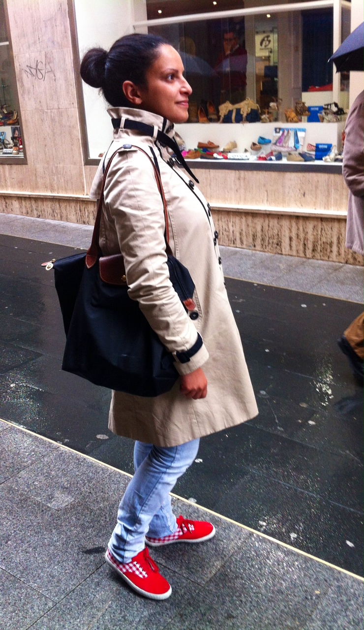 Dounia, en la calle Moret con trench y bolso de Longchamp
