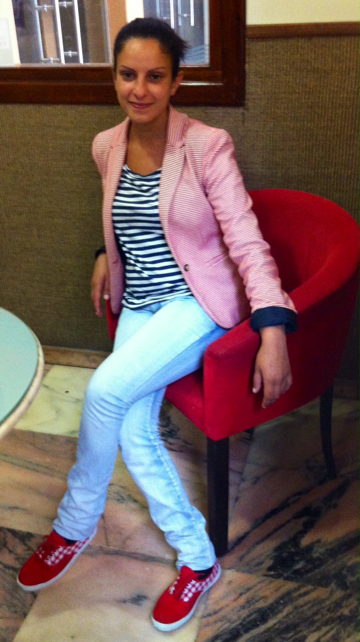 Hoy os traigo una propuesta cómoda y divertida para el fin de semana de la mano Dounia Mnassri, una abogada parisina de 32 años afincada en Cáceres desde 2008.  Ayer me encontré con ella en la cafetería El Corregidor, de la calle Moret. Me gustó,  sobre todo, su americana. Echad un vistazo.