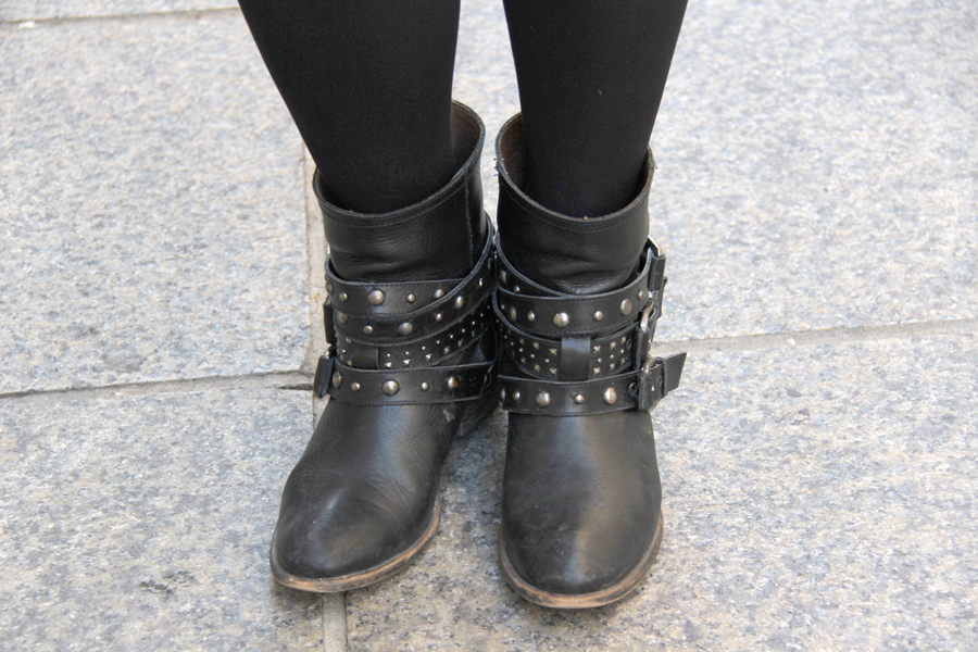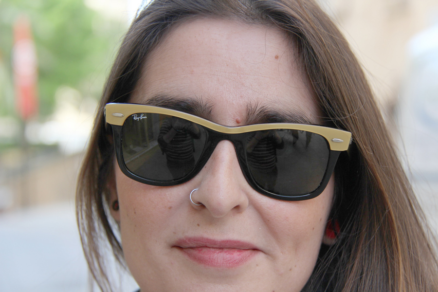 A Gema le gusta seguir las tendencias. Tanto, que hace dos años decidió montar su propia tienda en la Plaza de la Concepción de Cáceres. Se llama ‘Sanatorio de moda‘. Aquí podéis encontrar el vestido que luce en la imagen. Es de la marca Ada Gatti. Lleva rayas negras sobre fondo blanco y detalles en dorado (cuesta 25,90 euros). La chupa, de corte rockabilly, la adquirió en el Mercadillo de la Moderna Pobre, una iniciativa de la que os hablo unas líneas más abajo. La compró de segunda mano por el suculento precio de 12 euros. Las botas son de piel negra y lleva correas con tachuelas a la altura de los tobillos. Son de la marca Zendra, de la pasada temporada otoño-invierno. El bolso, negro y ‘nude’, es de Primark. Las gafas de sol son las Ray Ban Wayfarer. Es el mismo modelo de gafas que aparecía en el post anterior. La diferencia está en que éstas son de dos colores. ¡Me gustan mucho!