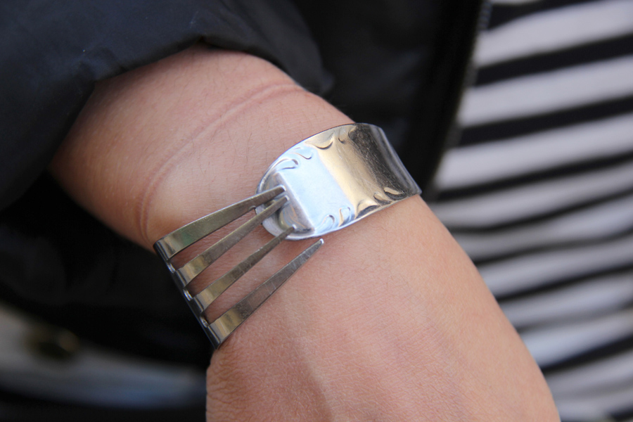 ¿Os habéis fijado en la pulsera que luce? Es un tenedor. “Fue un regalo que me hizo un amigo en el último campamento donde trabajé como monitora hace muchos años. No me la quito nunca. Es un brazalete muy especial”, cuenta. Gema estará el próximo domingo, día 13, en la calle Roso de Luna, donde se celebrará una nueva edición del Mercadillo de la Moderna Pobre. Se trata de una iniciativa puesta en marcha por dos tiendas: ‘Sanatorio de moda’ y ‘Monos con Pistolas’. La idea es que la gente que quiera desprenderse de sus prendas las ponga a la venta en esta cita a un precio más que asequible. Comenzará a las doce de la mañana y se dilatará hasta las tres de la tarde. Habrá desayuno para los asistentes. Si queréis más información sobre esta propuesta, os dejo el enlace de la información que publicó mi compañera Cristina Núñez el pasado mes de octubre: ‘Pobres, pero modernas’.