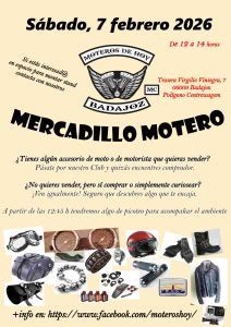 El próximo 7 de febrero celebraremos en la sede del Club Moteros de Hoy, Trasera Virgilio Viniegra, 7, 06009 Badajoz (Polígono Centrowagen Badajoz), un mercadillo motero abierto a todos los aficionados de las dos ruedas.