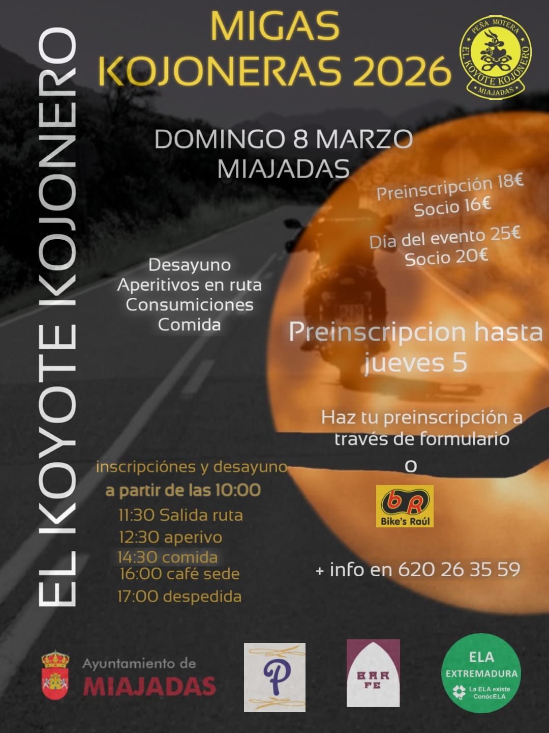 La Peña Motera El Koyote Kojonero vuelve a la carga con uno de los eventos más queridos de la zona: las Migas Kojoneras 2026, una jornada que combina tradición, ruta, gastronomía y el mejor ambiente motero. La cita será el domingo 8 de marzo en Miajadas, y promete reunir a moteros de toda Extremadura y alrededores.