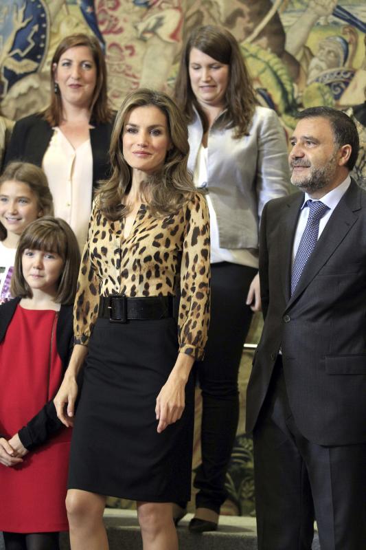 Es lo que tiene estar constantemente en el escaparate. Que te ven. Y sí, por ahí venía más o menos la queja que hace un par de meses recogieron unos cuantos medios escritos de este país. La queja de doña Letizia. La queja esa de que pretendía ser una princesa de 8 a 15. La queja que envolvía una crisis de pareja real que al final se quedó en nada, en una mala interpretación de la prensa de este país. Vamos, que desde dentro de palacio alquien tiró la piedra y luego escondió la mano. En fin, eso son suposiciones mías. Y todo esto viene a cuento porque la futura Reina de España, pretendiéndolo, porque a mí ya nadie me convence de lo contrario, siempre da motivos para dar que hablar. Este lunes, en el estreno de la semana, por su blusa de leopardo en una recepción con alumnos y docentes del centro infantil y de primaria ‘Príncipe de Asturias’.
