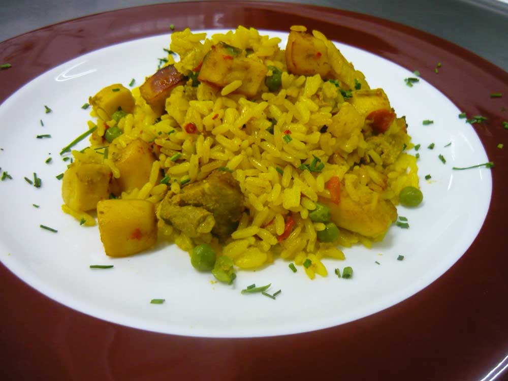 Se añade el arroz y se rehoga, se añade el colorante y el fumet.