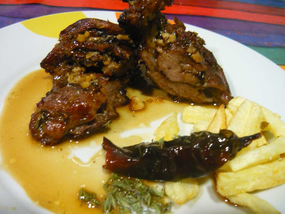 Se baja el horno a 120ºC y se le incorpora el pimiento picante y el tomillo. Y por intervalos de 10 minutos, rociamos la carne con el jugo que habíamos preparado. En una hora estará lista.