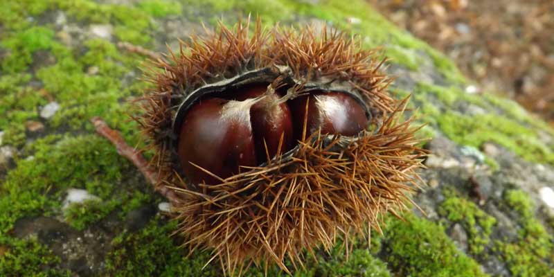 En el camino podemos encontrar algunas castañas, aunque aquí abundan sobre todo los pinos de repoblación.