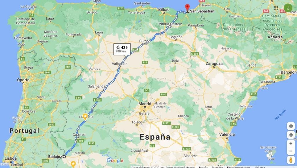 -Salida Badajoz y llegada a San Sebastián en bici, 788 kilómetros por carretera, con un desnivel positivo acumulado de 9.200 metros.