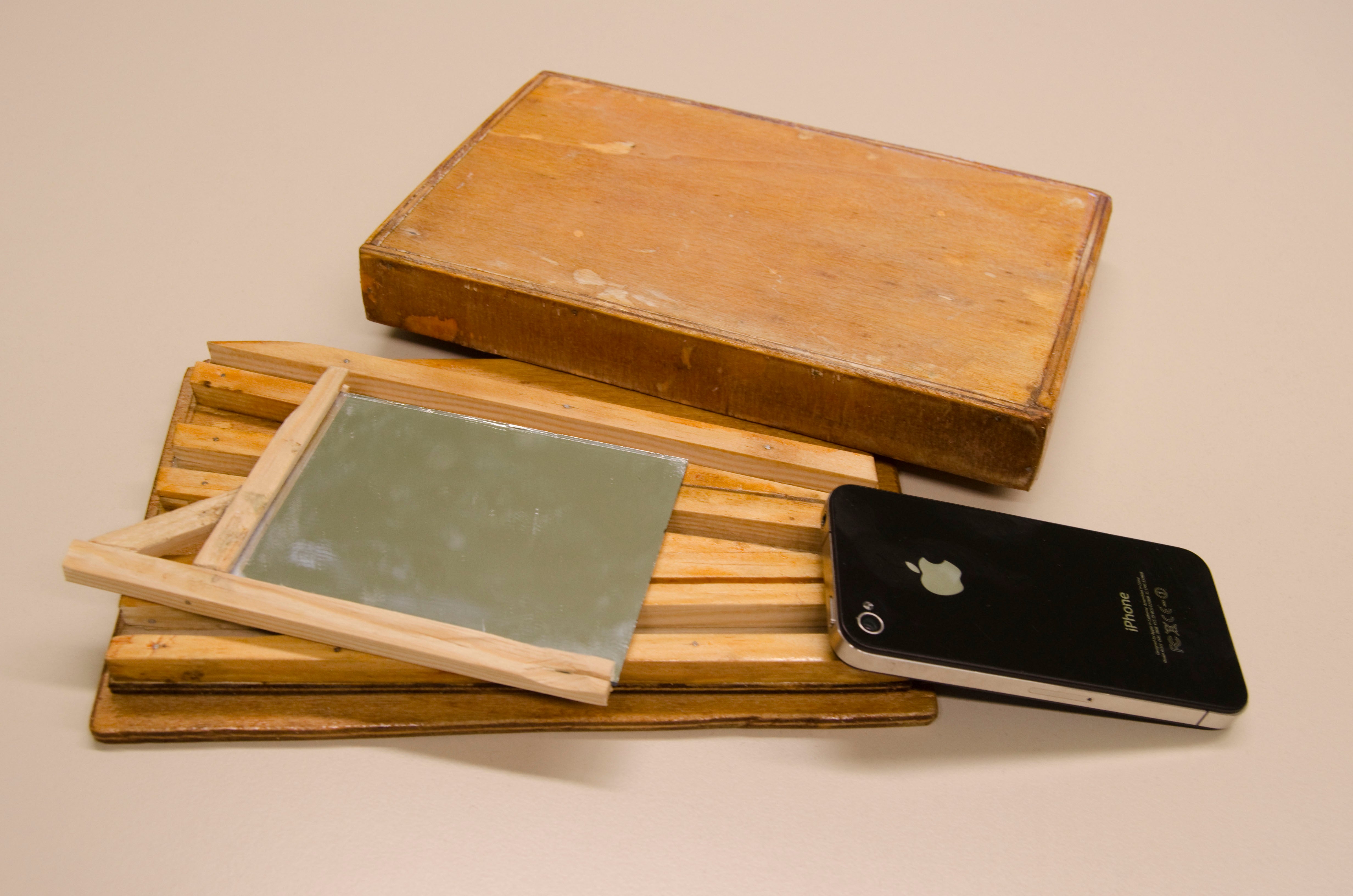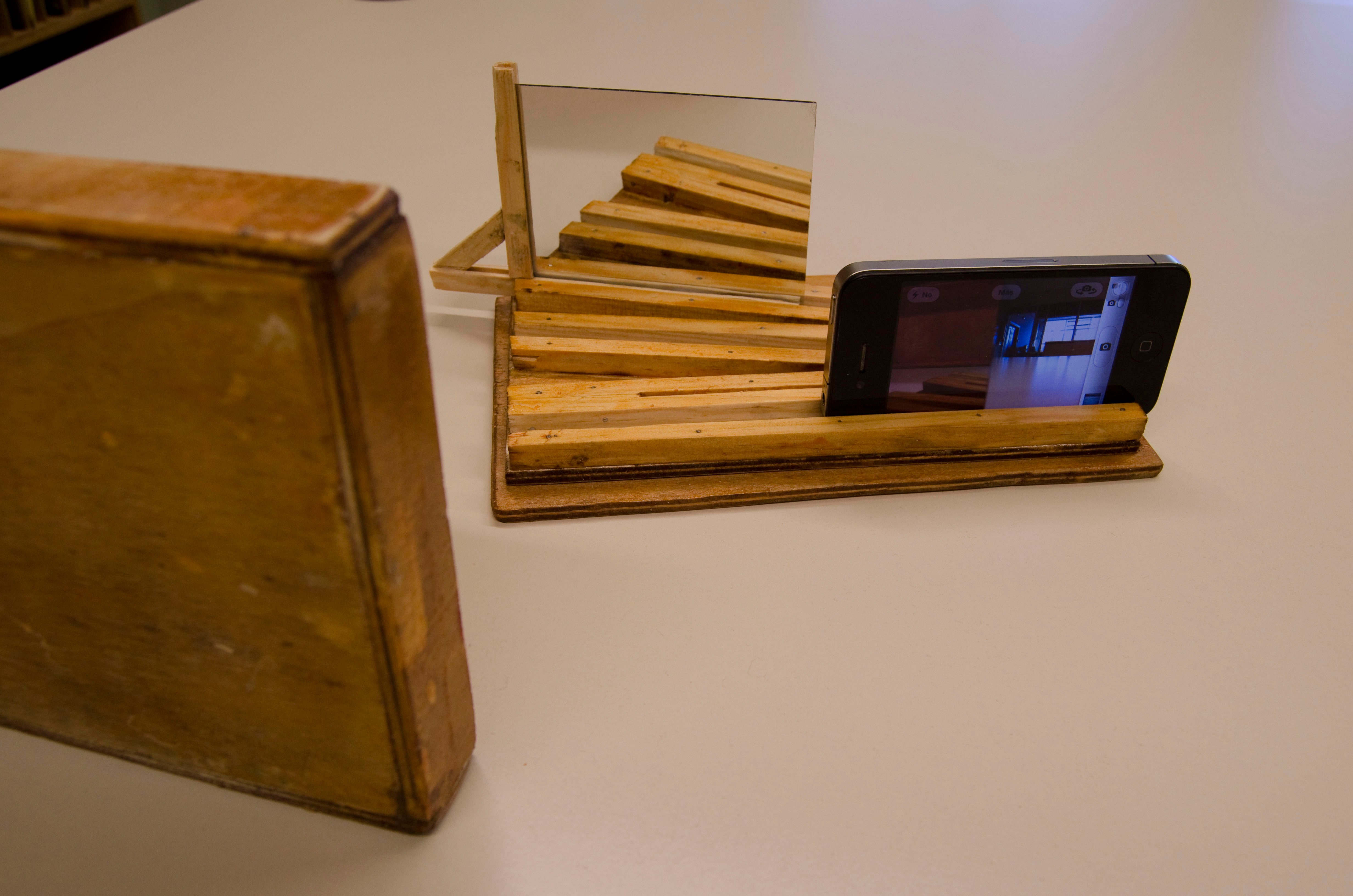 El dispositivo no es más que una plataforma de madera hecha a mano y un espejo que se desliza por una ranura. Realmente genera un efecto bastante interesante, ya que permite grabar imágenes de lo que está delante de la cámara y lo que está detrás simultáneamente e incluso mezclarlas en tiempo real.