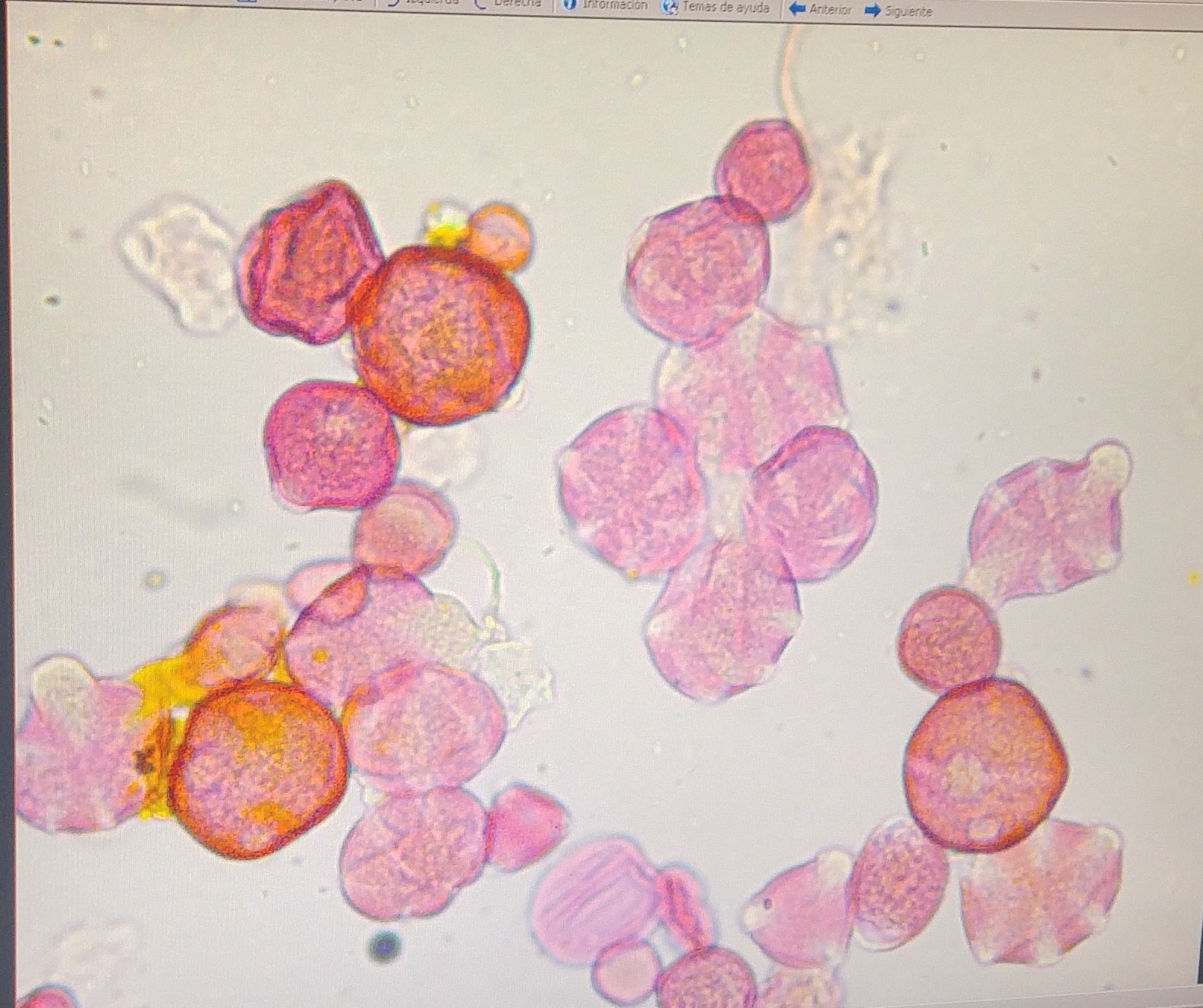 La técnico de laboratorio nos explicó que tras muchos años de dedicación y trabajo es capaz de reconocer cada tipo de polen que aparece en las muestras por su forma y tamaño: polen de diferentes especies de Cistus (jaras), polen de azahar (naranjo o limonero), eucalipto o girasol, entre otros.